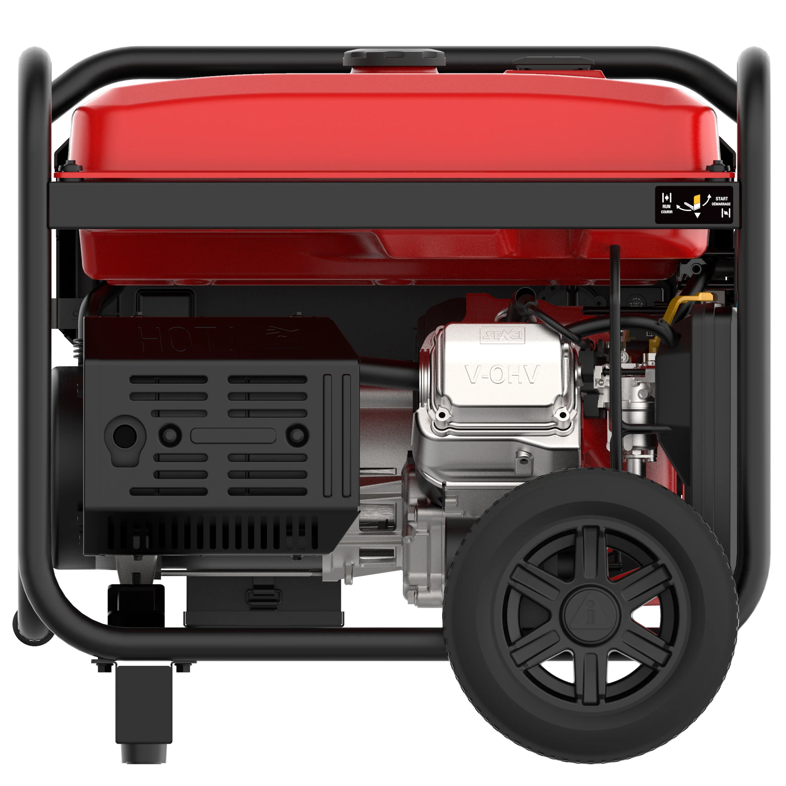 With a 459cc OHV Performance Series engine with a cast iron sleeve and low oil shutdown, this tri-fuel remote generator offers 11,300 starting watts and 9,000 running watts on gasoline; 10,100 starting watts with 8,100 running watts on propane; and 9,000 starting watts and 7,200 running watts on NG. The 9.5-gallon fuel tank provides an extended run time of up to 18 hours at 25% load.